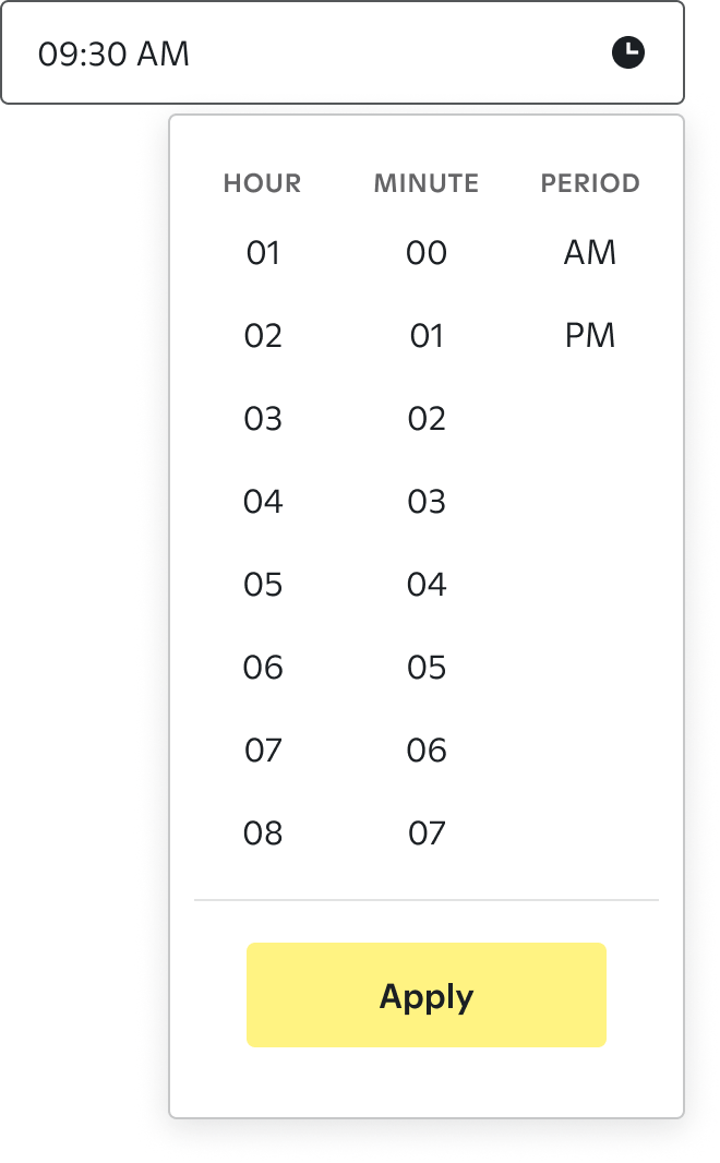 Product Designers begin to explore UX & UI iterations on how a Timepicker will operate in our UI, abiding by the tenets of accessibility, brand expression, and product needs. Progress is shared in the weekly Picnic Party.